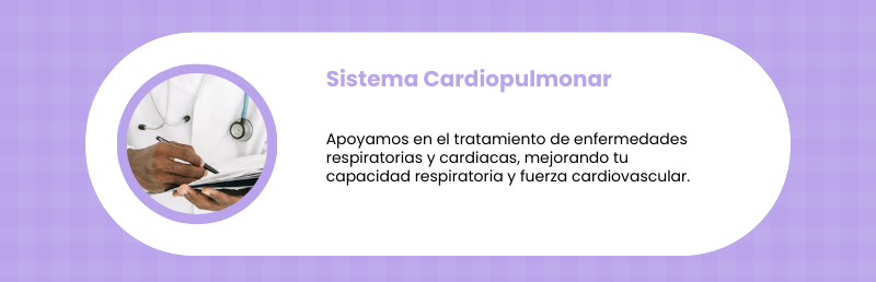 - Fortalecimiento del sistema cardiopulmonar: Apoyo en el tratamiento de asma, bronquitis crónica, recuperación tras un infarto o cirugía cardíaca.