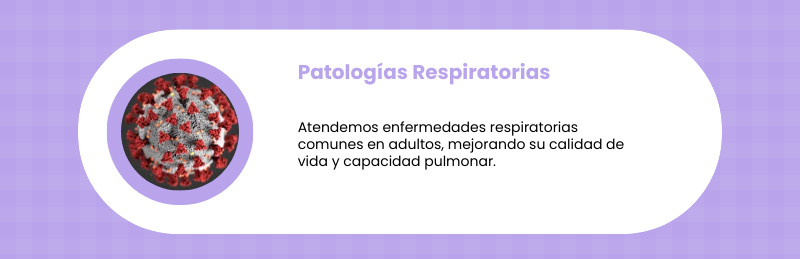 - Atención en patologías respiratorias en adultos: Tratamos EPOC, asma, neumonías, enfisema pulmonar, entre otras.