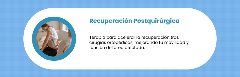 - Recuperación postquirúrgica ortopédica: Terapia para acelerar la rehabilitación tras cirugías.